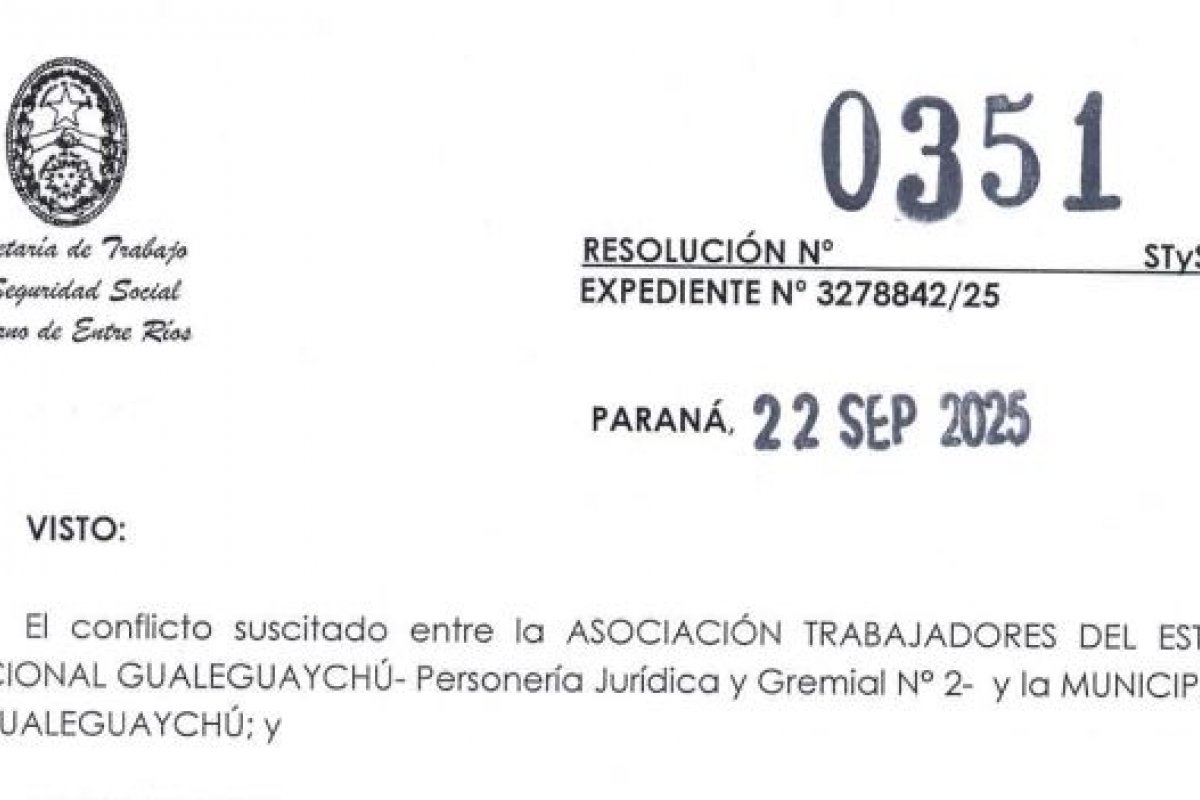 El Gobierno de Gualeguaychú informa que, mediante Resolución N°351/2025 de la Secretaría de Trabajo y Seguridad Social de Entre Ríos, se resolvió declarar ilegal la medida de acción directa que había sido iniciada por la Asociación Trabajadores del Estado (ATE) el 17 de septiembre de 2025, y que actualmente está vigente en el ámbito municipal por tiempo indeterminado.