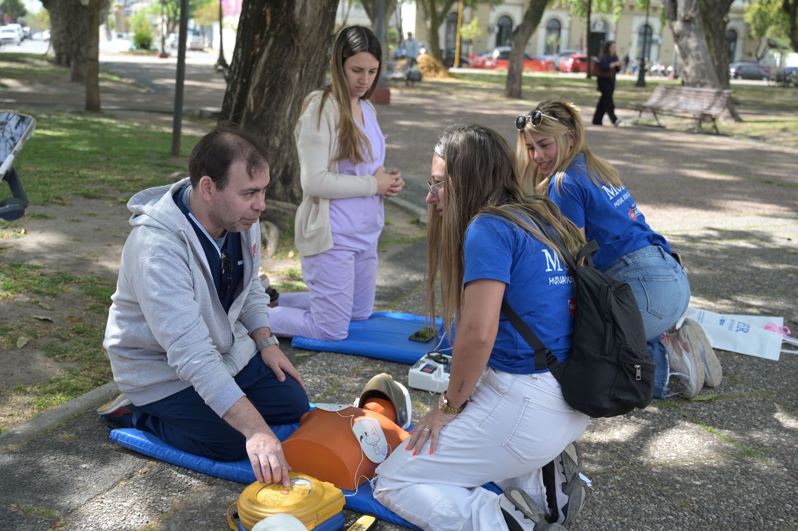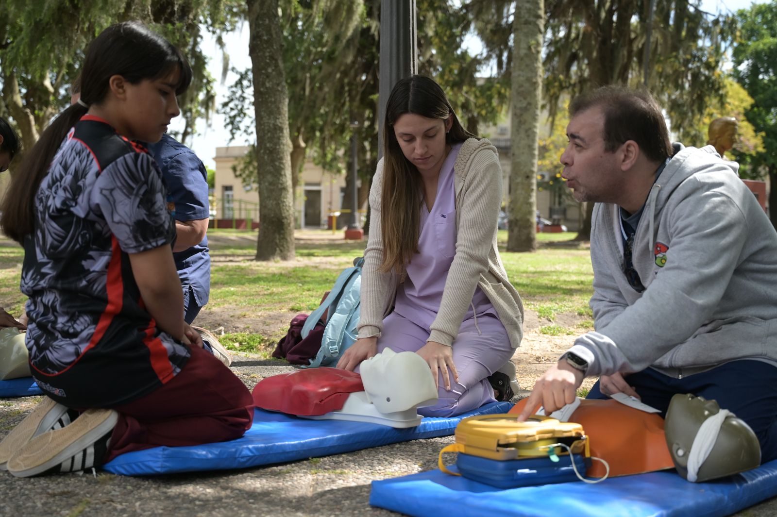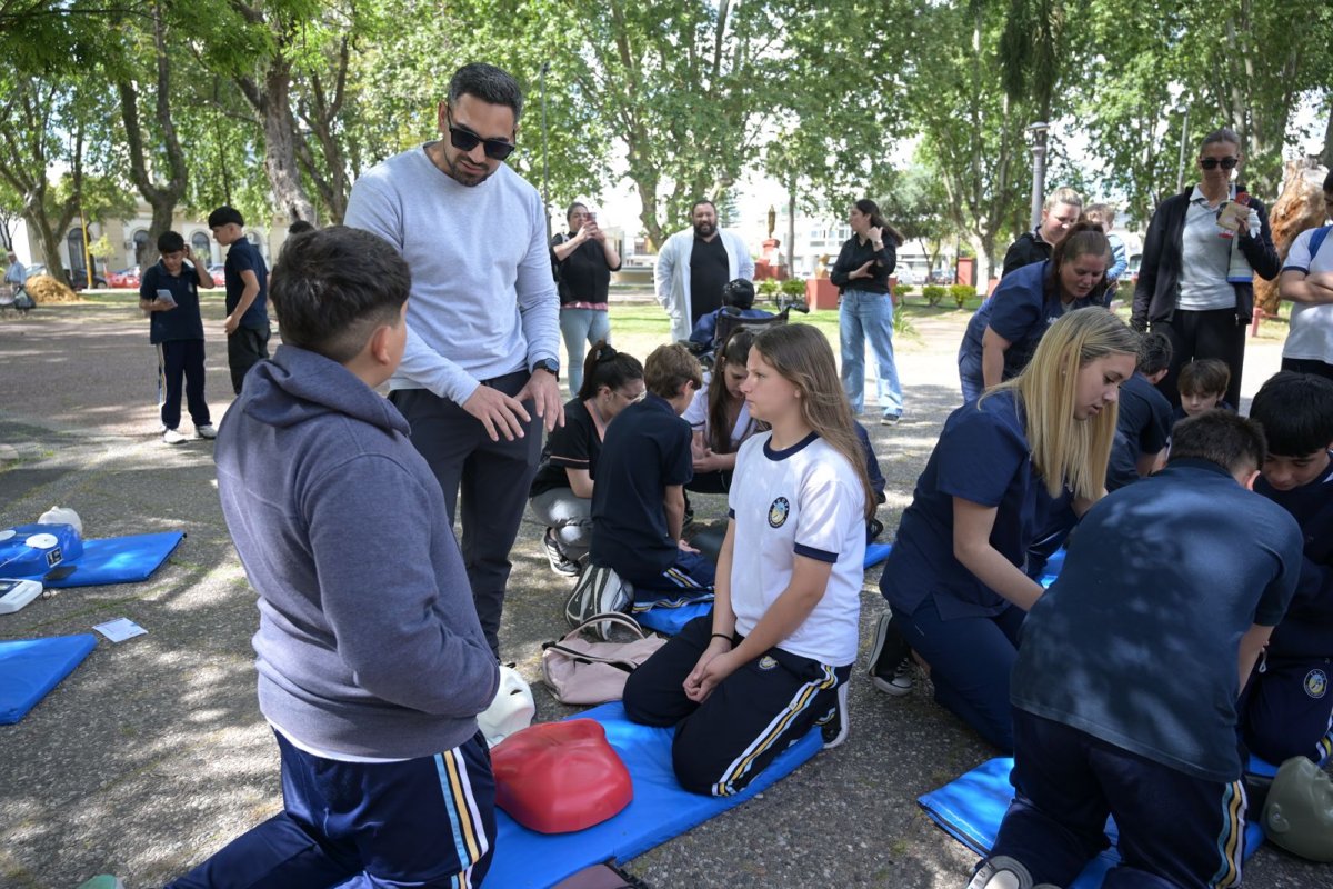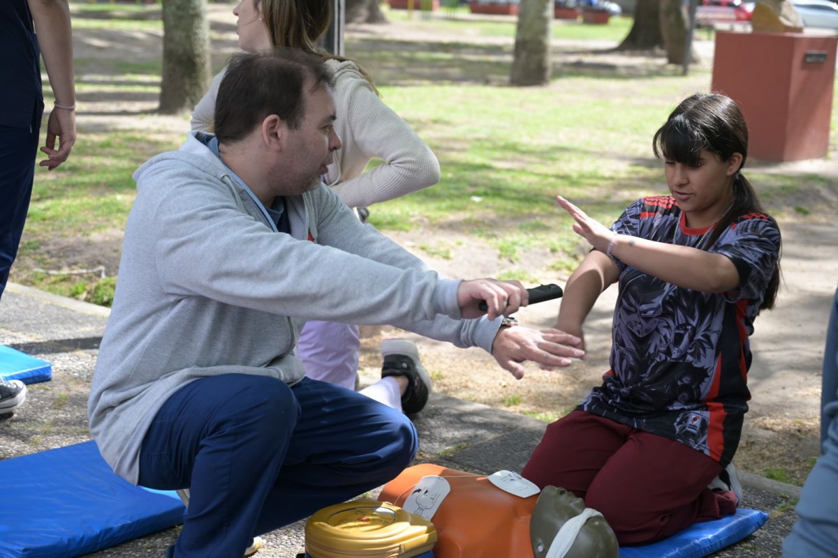 Una de las instancias más destacadas fue la capacitación en RCP y maniobra de Heimlich, a cargo del enfermero Luciano Gómez y profesionales de salud en articulación con estudiantes de la Tecnicatura Superior en Enfermería del Instituto María Inés Elizalde. Allí, los participantes pudieron aprender y practicar técnicas fundamentales para actuar en casos de emergencia, reforzando la importancia de contar con una comunidad entrenada y preparada.