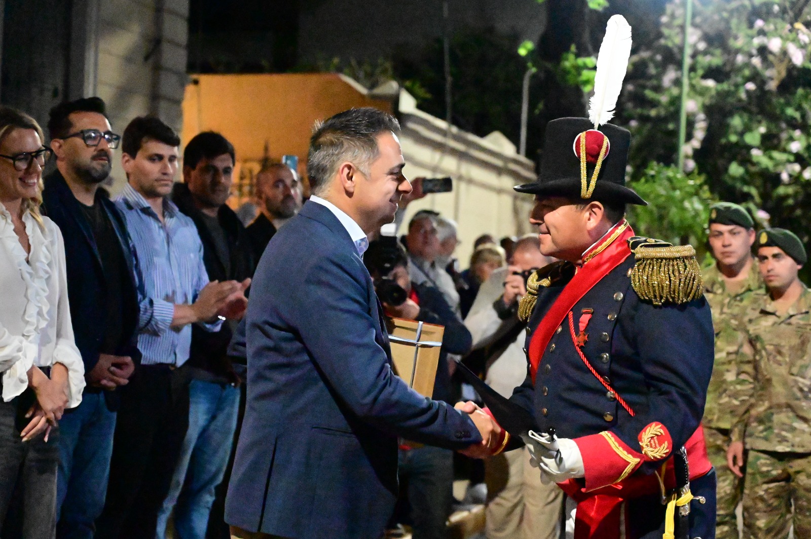 El intendente Mauricio Davico y la viceintendente Julieta Carrazza, junto al ministro de Planeamiento, Infraestructura y Servicios de la provincia, Darío Schneider, funcionarios municipales y una multitud de vecinos recibieron este viernes, frente al Palacio Municipal, a los integrantes de la Banda Militar “Tambor de Tacuarí”, perteneciente al Regimiento de Infantería 1 Patricios, quienes llegaron desfilando e interpretando la marcha militar de infantería " Avenida de las Camelias".