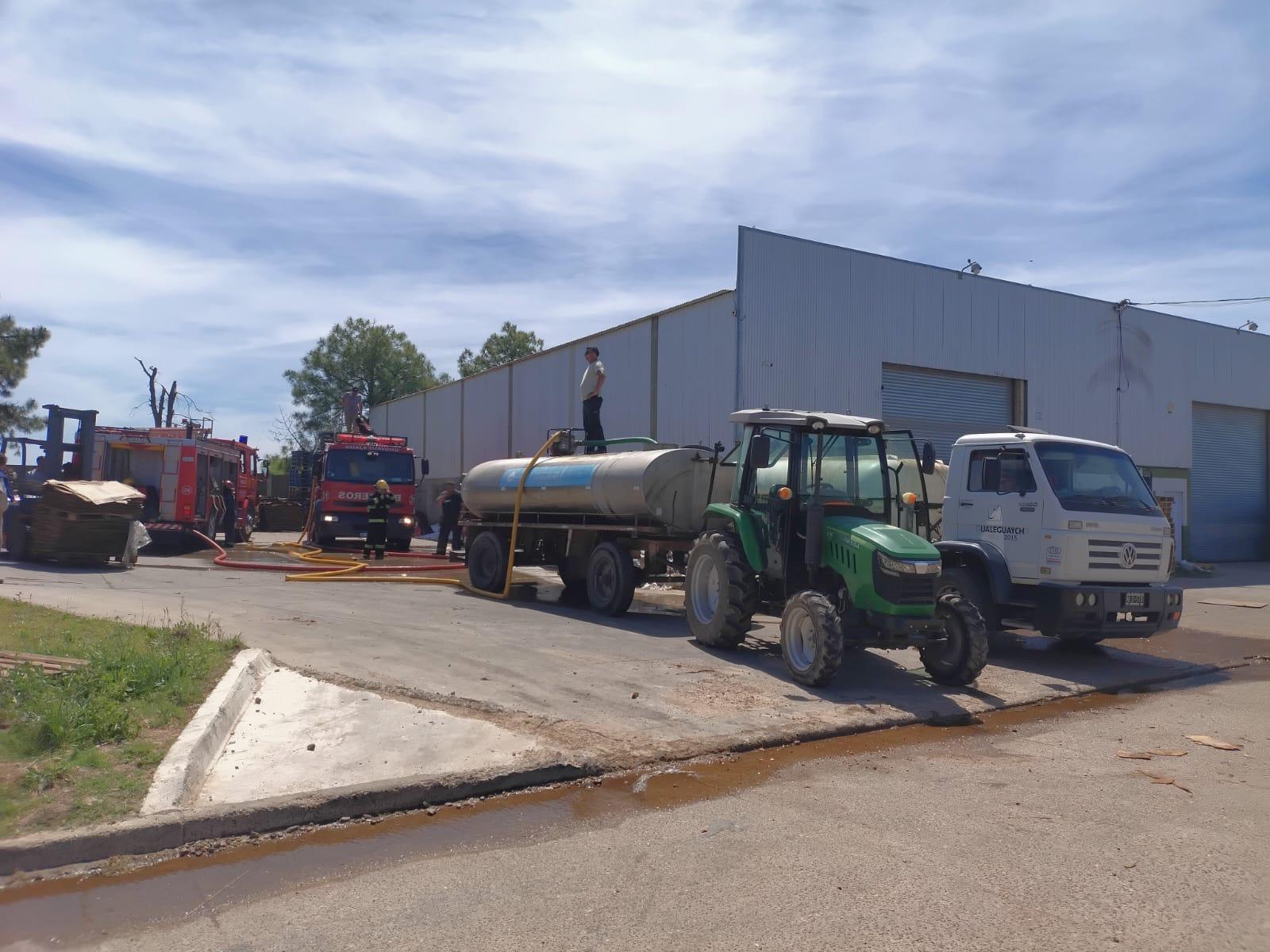 El operativo contó con el apoyo logístico de dos cisternas a tractor y un camión regador municipal, que aportaron asistencia hídrica a las tareas de extinción. Además, un tractor con pala frontal colaboró en la remoción de materiales, junto a dos autoelevadores, uno perteneciente a la empresa afectada y otro a una firma vecina, que también sumaron esfuerzos al operativo.