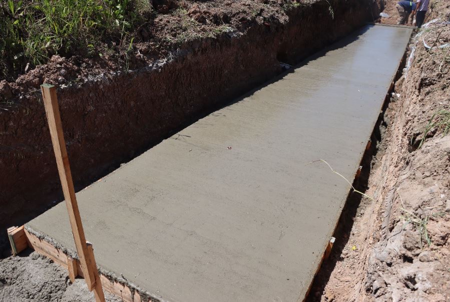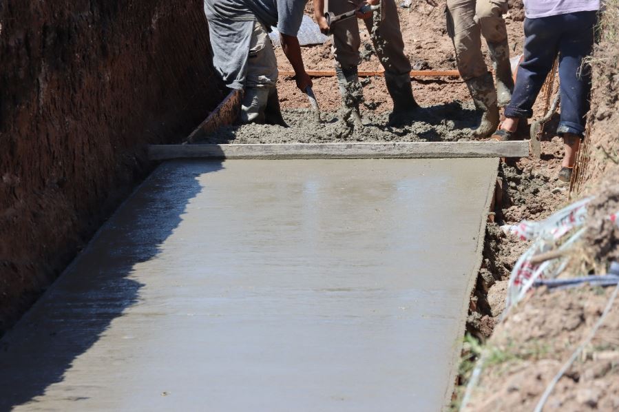 Durante la primera jornada de trabajo coordinado entre la cuadrilla municipal y los equipos de obra se utilizó una retroexcavadora para abrir la zanja con la profundidad y pendiente adecuadas, mientras que el personal de Obras Públicas realizó la colocación de encofrados de madera, el vertido del hormigón y su nivelación manual, lo que aseguró la compactación necesaria para la resistencia estructural. Sobre la superficie se utilizaron herramientas manuales como palas, picos y reglas metálicas que permitieron dar forma y terminación a la losa del conducto.