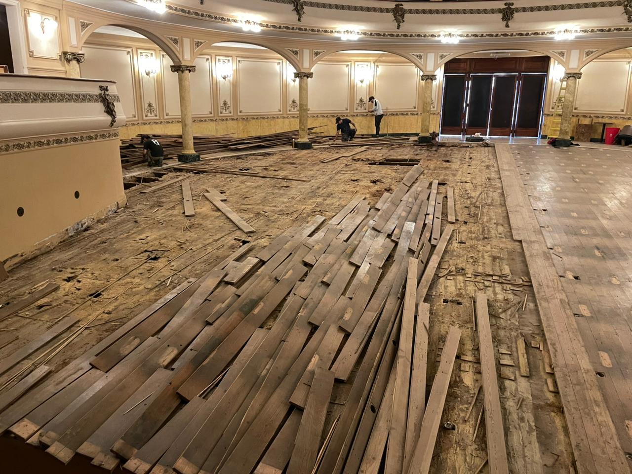 La intervención actual tiene como objetivo principal remover la totalidad de los tablones del piso, con la intención de conservarlos y reincorporarlos una vez finalizadas las obras de refacción. En esta primera etapa se avanza con la extracción de las tablas y del fenólico subyacente. Mientras que el fenólico será reemplazado, las maderas originales —en aproximadamente un 80%— serán cuidadosamente recuperadas.