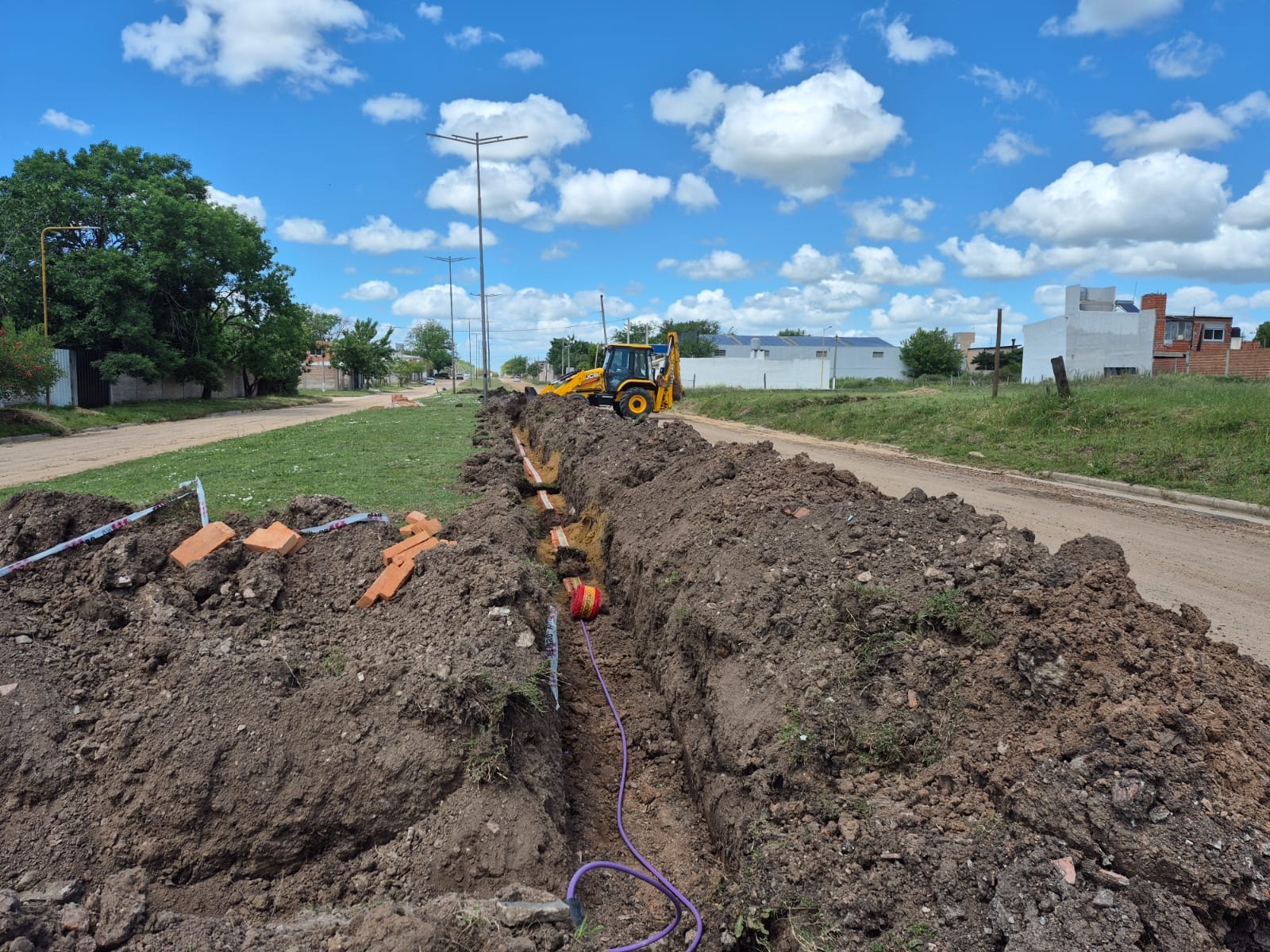 La intervención comenzó con la apertura de zanjas profundas a lo largo del cantero central, en las que se realiza la colocación de los conductores eléctricos subterráneos. Cada tramo de zanjeo es cuidadosamente rellenado con materiales seleccionados y protegido con cintas de señalización de seguridad, tal como lo indican las normativas técnicas vigentes. Este tipo de instalaciones garantiza mayor durabilidad, evita riesgos eléctricos y preserva la estética del entorno al eliminar el tendido aéreo tradicional.