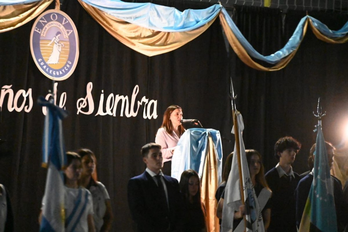 En la reseña histórica, se recordó que ENOVA fue creada en 1910 como Escuela Normal Mixta de Gualeguaychú, y que en 1924, por decreto del presidente Marcelo T. de Alvear, adoptó el nombre actual en homenaje al poeta entrerriano. Desde entonces, miles de alumnos pasaron por sus aulas, dejando una huella imborrable en la educación local y regional.