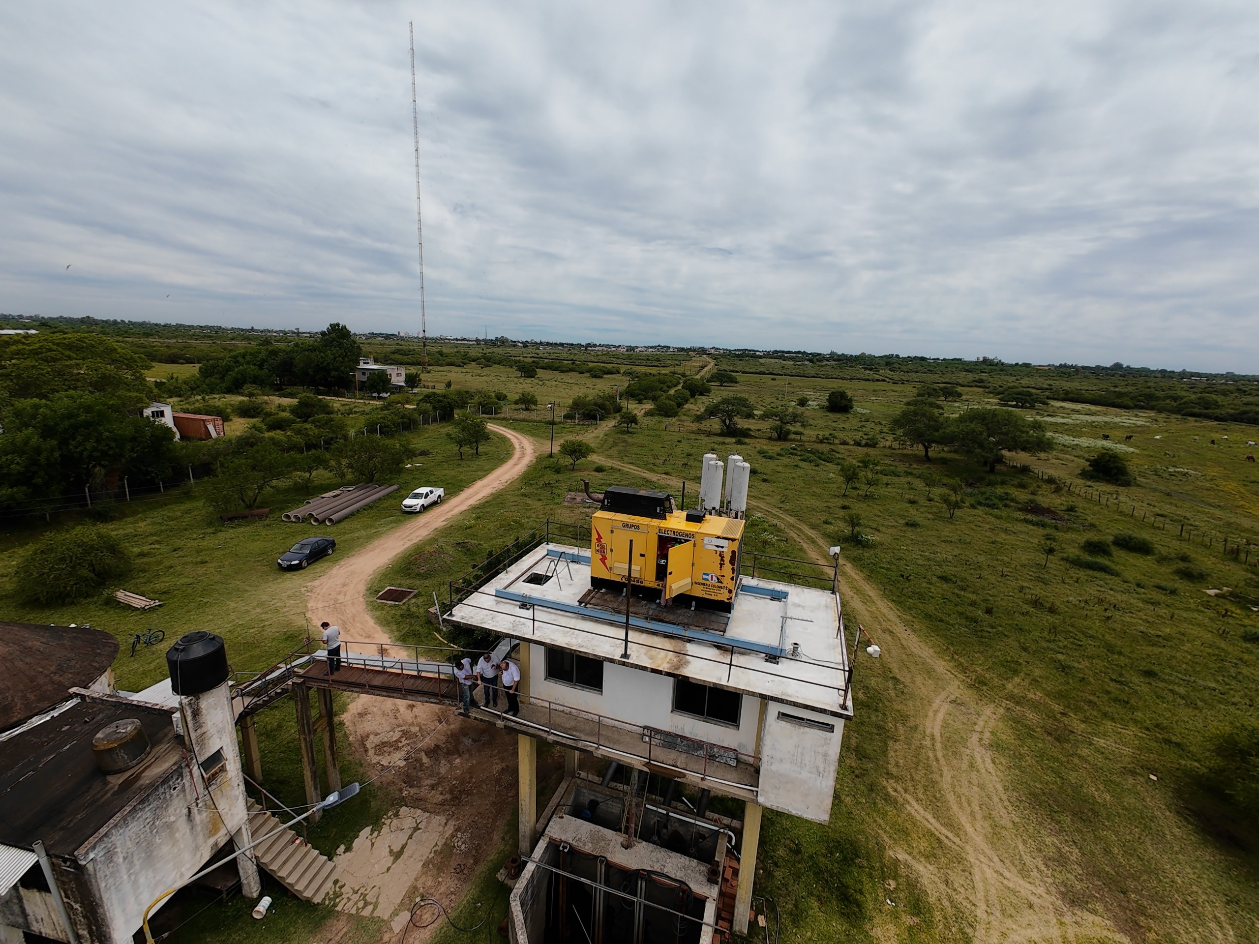 Para concretar la instalación fue necesario desplegar un operativo de logística de gran escala: El generador eléctrico, con un peso aproximado de ocho toneladas, se encuentra emplazado sobre el techo del edificio de la Toma de agua, en una altura cercana a los quince metros. Esa condición requirió la utilización de una grúa telescópica de gran porte, capaz de elevar y posicionar el equipamiento con precisión milimétrica, garantizando seguridad estructural y correcto asentamiento sobre la base preparada.
