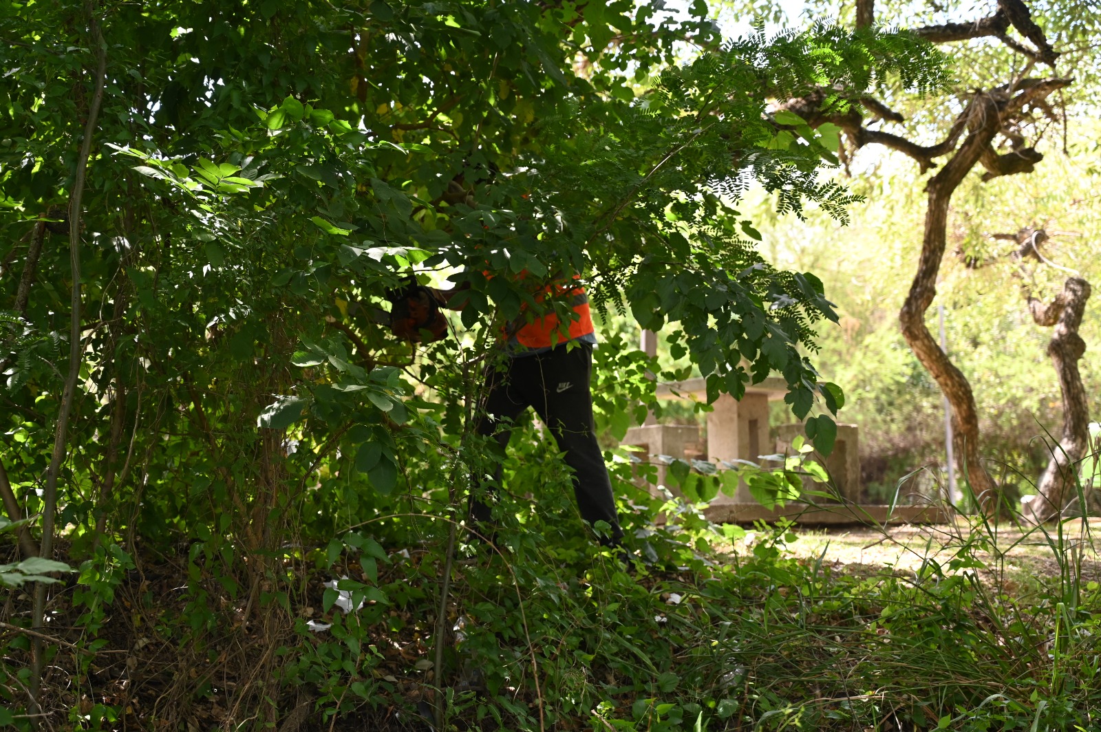El operativo incluyó poda de levante para despejar visuales y liberar sectores de circulación, además del retiro sistemático de ramas y restos de gran porte acumulados bajo la arboleda.