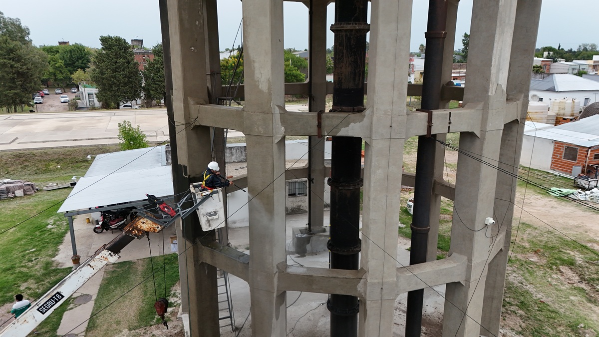 El tanque principal de Obras Sanitarias, emplazado en la planta potabilizadora de Gualeguaychú, atraviesa una intervención destinada a recuperar condiciones estructurales y sanitarias básicas de un elemento que ya es un sello distintivo de la Dirección encargada de la distribución de agua potable en la ciudad.
