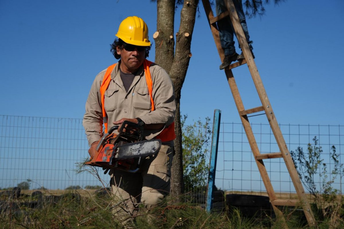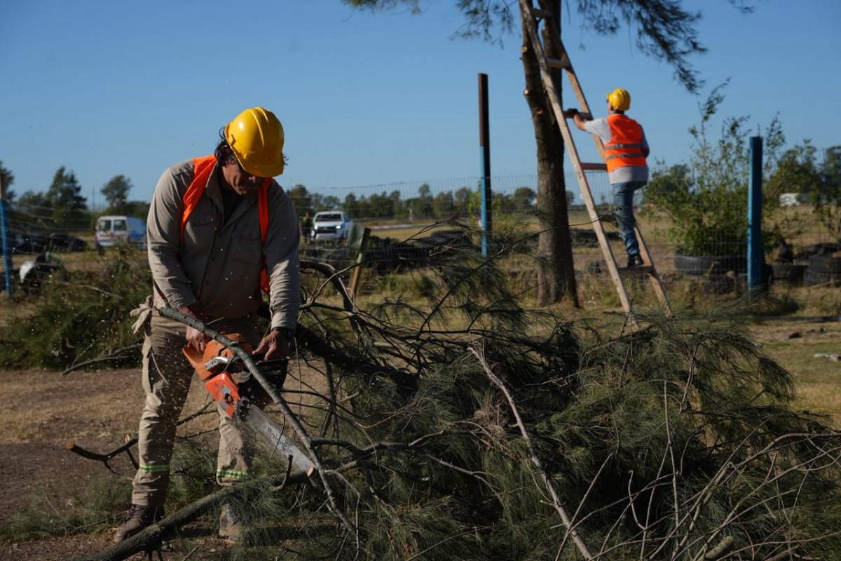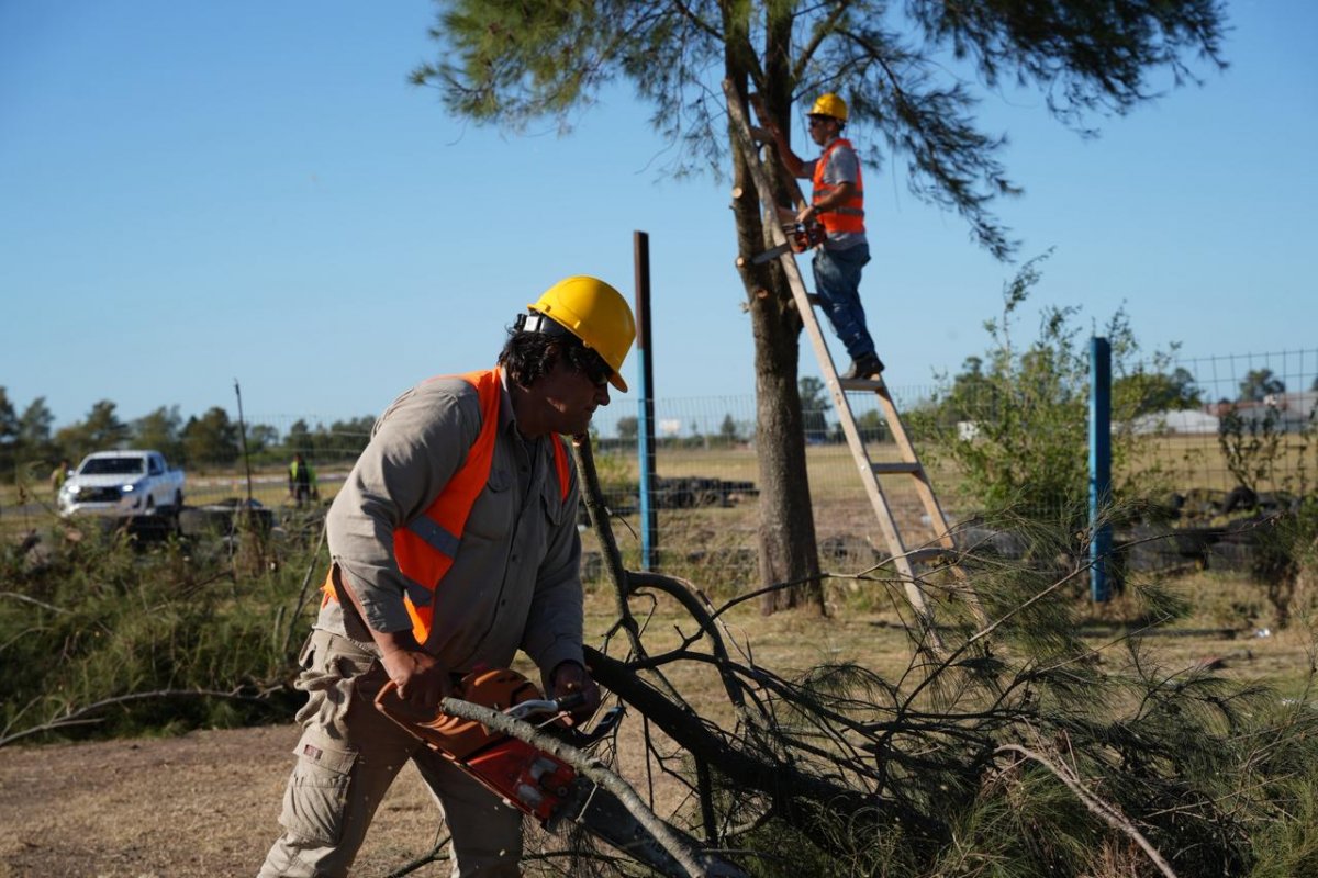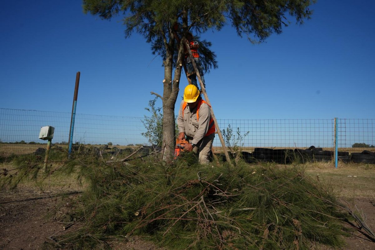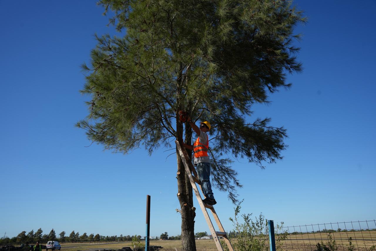 La Dirección de Espacios Verdes dispuso además un operativo sobre la arboleda implantada en el perímetro, ubicado a la vera de la Ruta Nacional 14, donde se realizó una poda de levante sobre ejemplares de casuarinas para mejorar su desarrollo y seguridad.