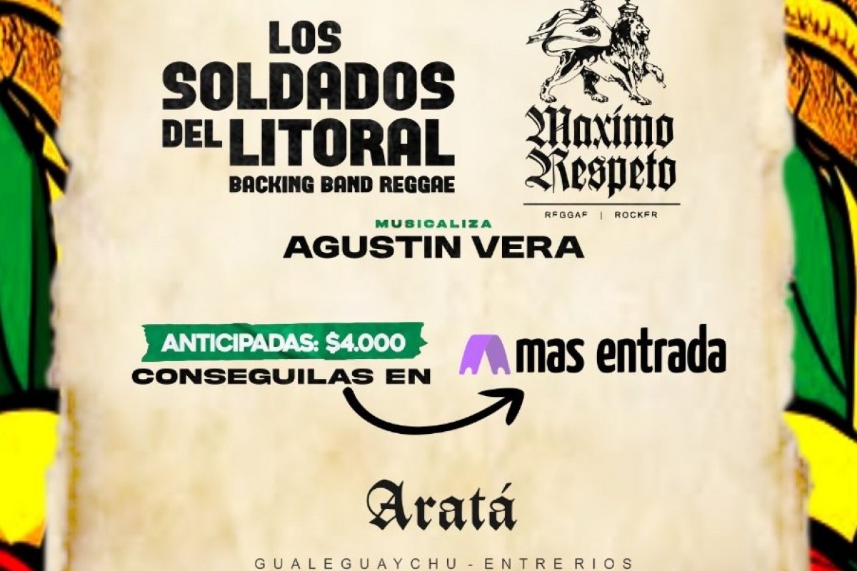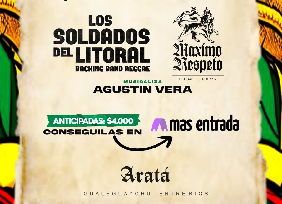 La banda de reggae de Gualeguaychú, Los Soldados del Litoral, tocará el próximo viernes 11 de abril en Aratá, donde compartirá escenario con Máximo Respeto en una fecha que reúne proyectos locales vinculados al género.