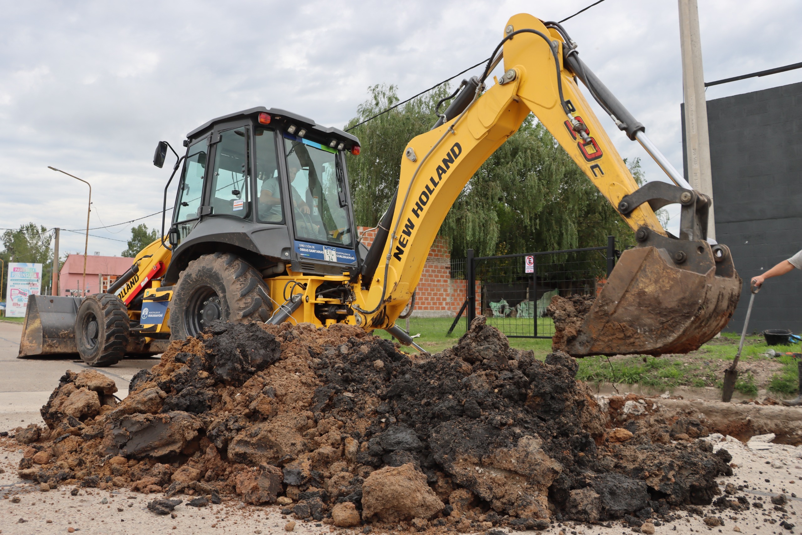 Las tareas contemplan la vinculación del sistema interno del predio con una cámara colectora existente, y para concretar esta instancia el equipo técnico debió descubrir la estructura mediante excavación mecánica, con retroexcavadora y asistencia de un camión para el retiro de suelo removido hasta exponer el conducto principal y permitir los empalmes correspondientes.