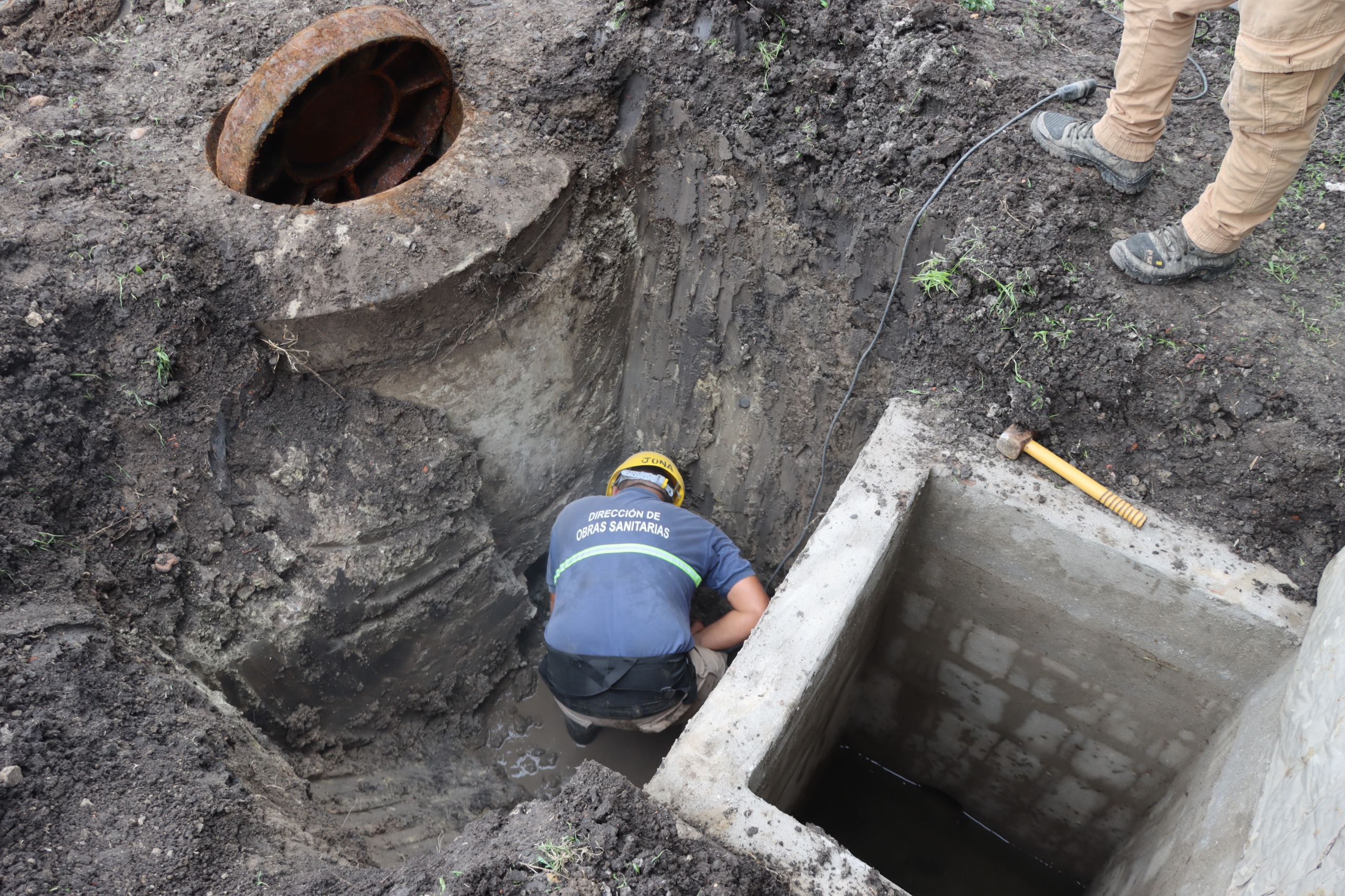 Una vez alcanzada la cámara, se avanzó en la conexión de las cañerías internas del complejo al sistema cloacal de la ciudad, con intervención directa de personal de la Dirección de Obras Sanitarias, que trabajó en profundidad dentro del conducto para asegurar la correcta vinculación hidráulica.