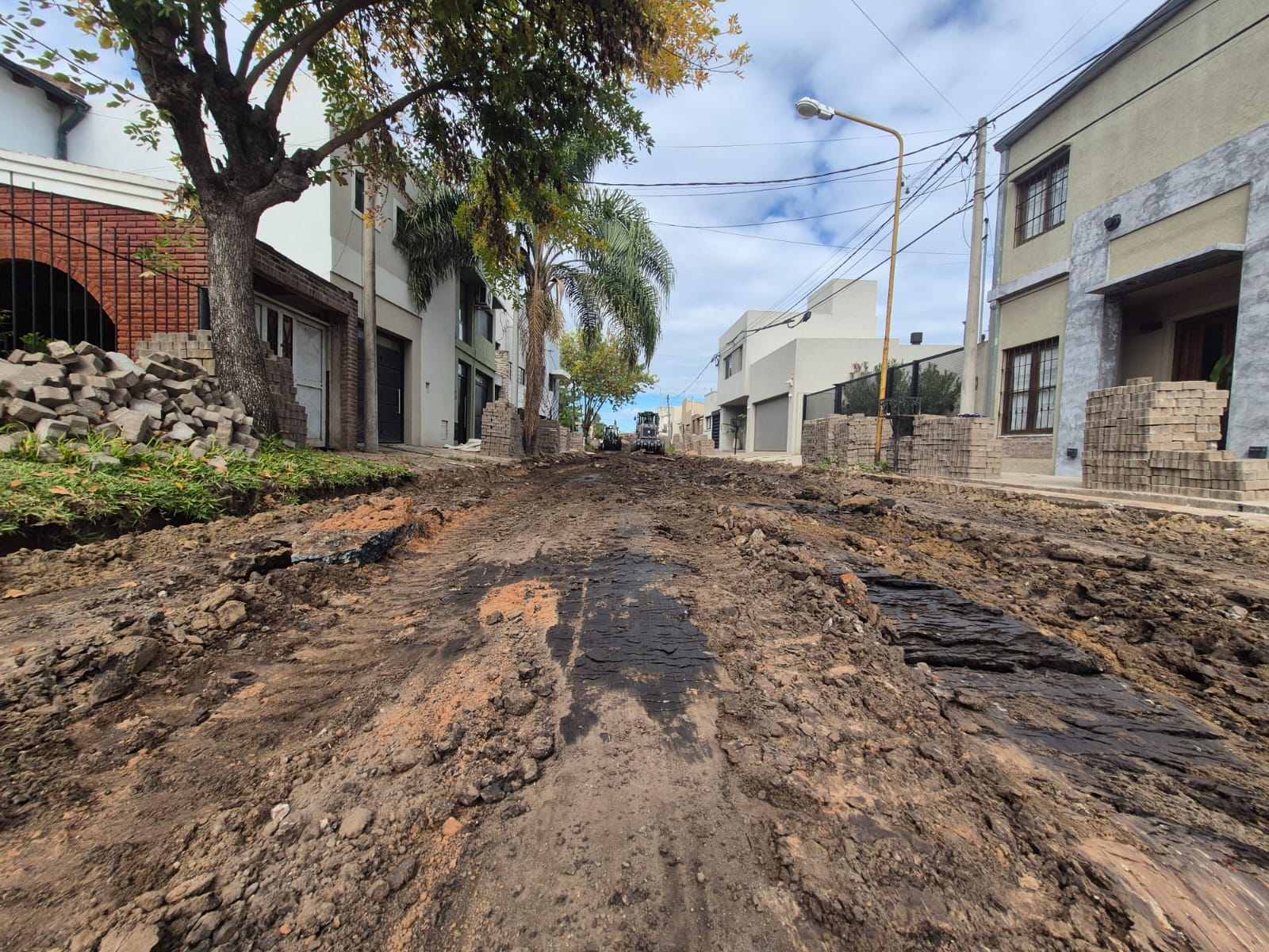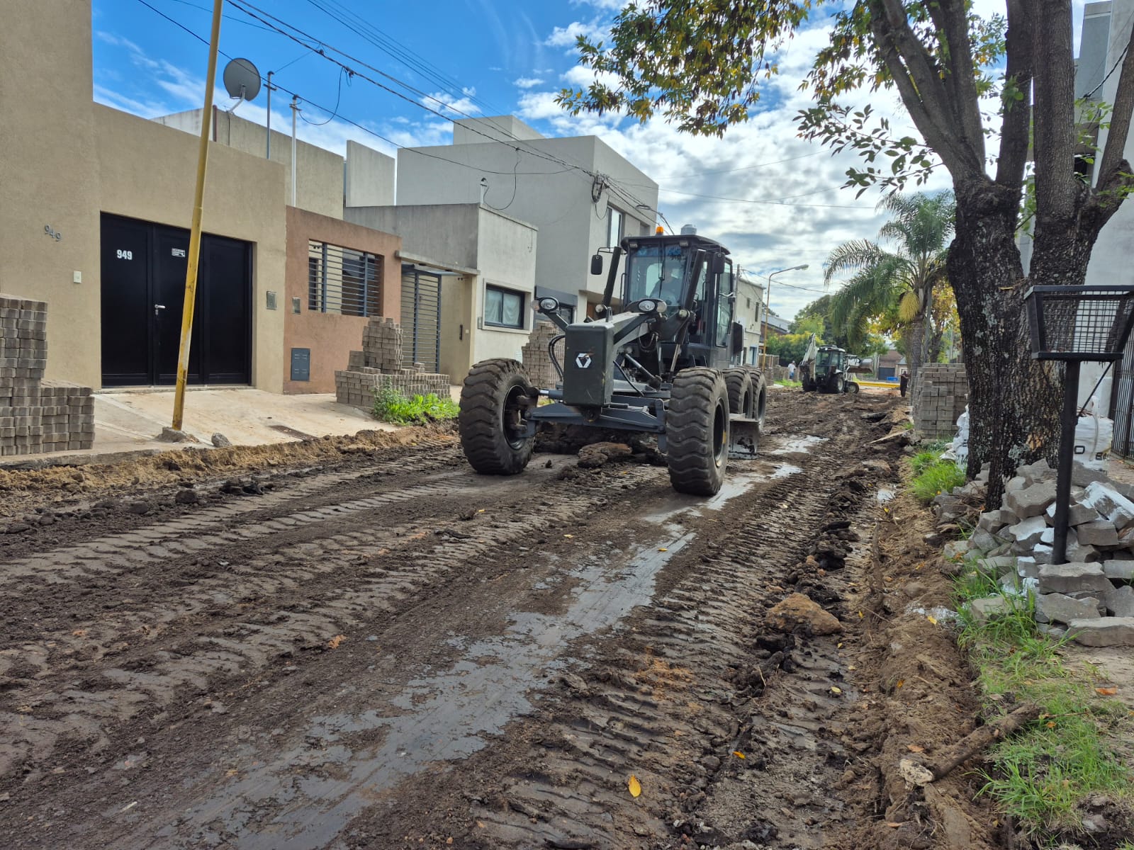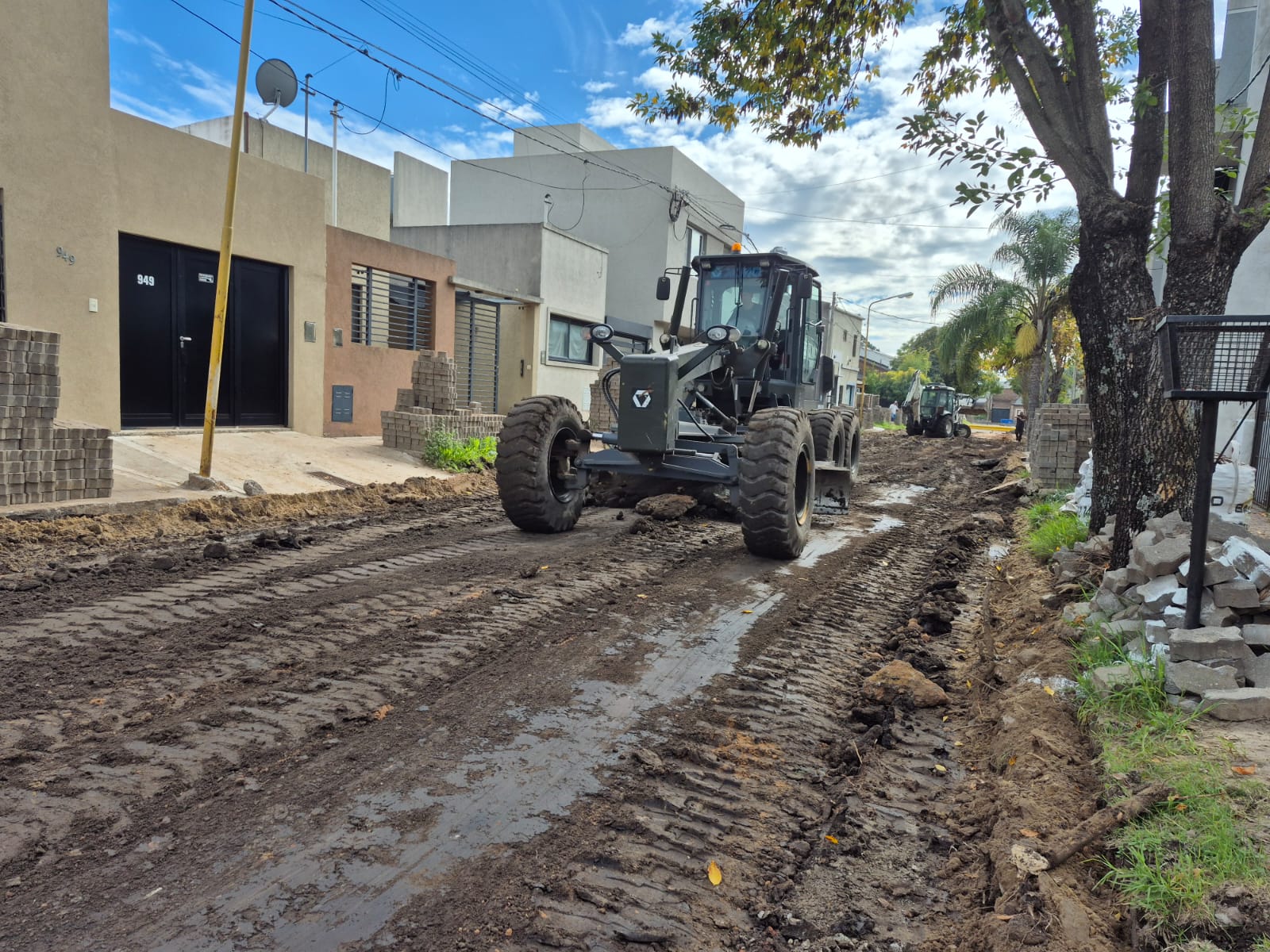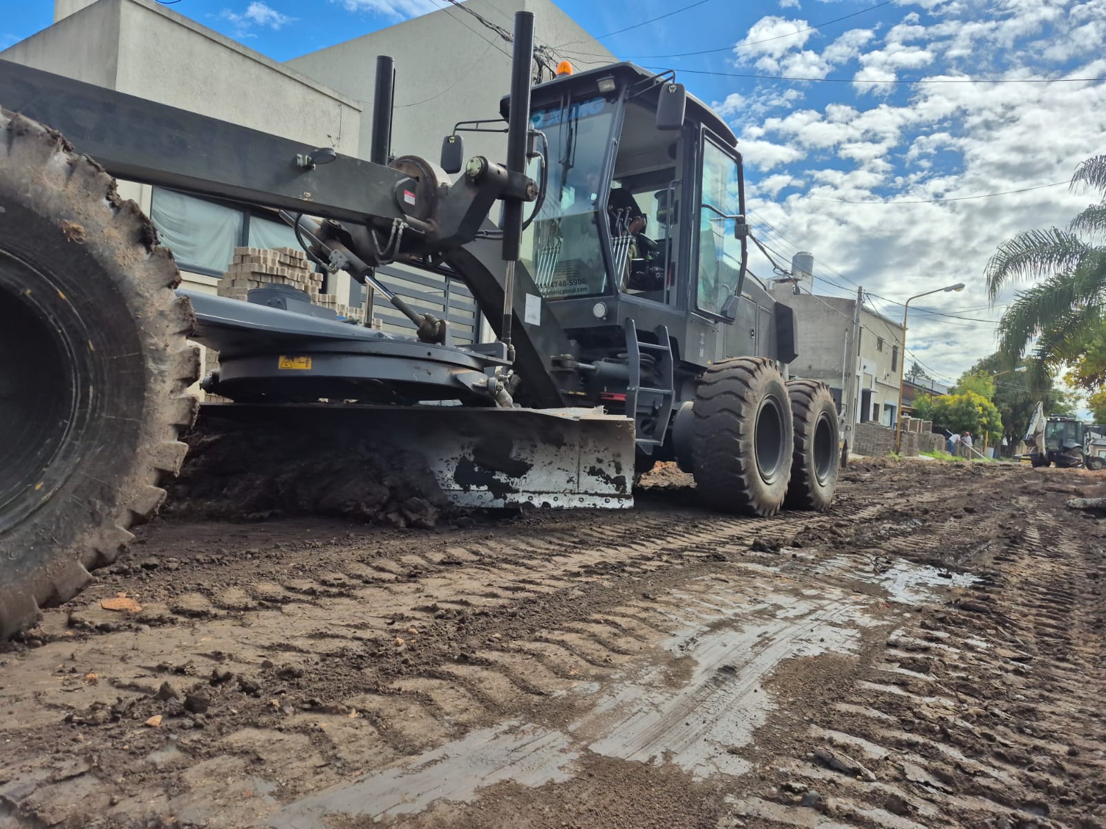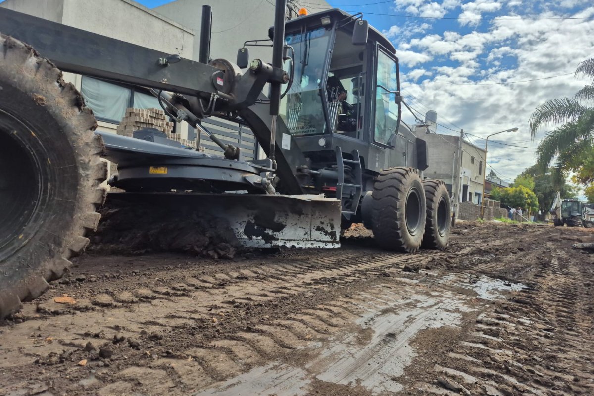 Con la base de tierra de la calle en tierra al descubierto, los equipos —entre ellos una motoniveladora y una retro— procedieron a la consolidación de la subrasante con cemento en los sectores de mayor fragilidad, una intervención que garantiza que el nuevo paquete estructural tenga una base firme y homogénea sobre la cual trabajar.